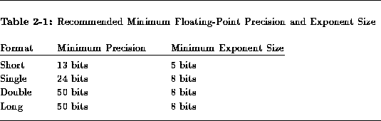 Implementation note: It is recommended that an implementation provide as many distinct floating-point formats as feasible, using table 2-1 as a guideline. Ideally, short-format floating-point numbers should have an ``immediate'' representation that does not require heap allocation; single-format floating-point numbers should approximate IEEE proposed standard single-format floating-point numbers; and double-format floating-point numbers should approximate IEEE proposed standard double-format floating-point numbers [23,17,16].